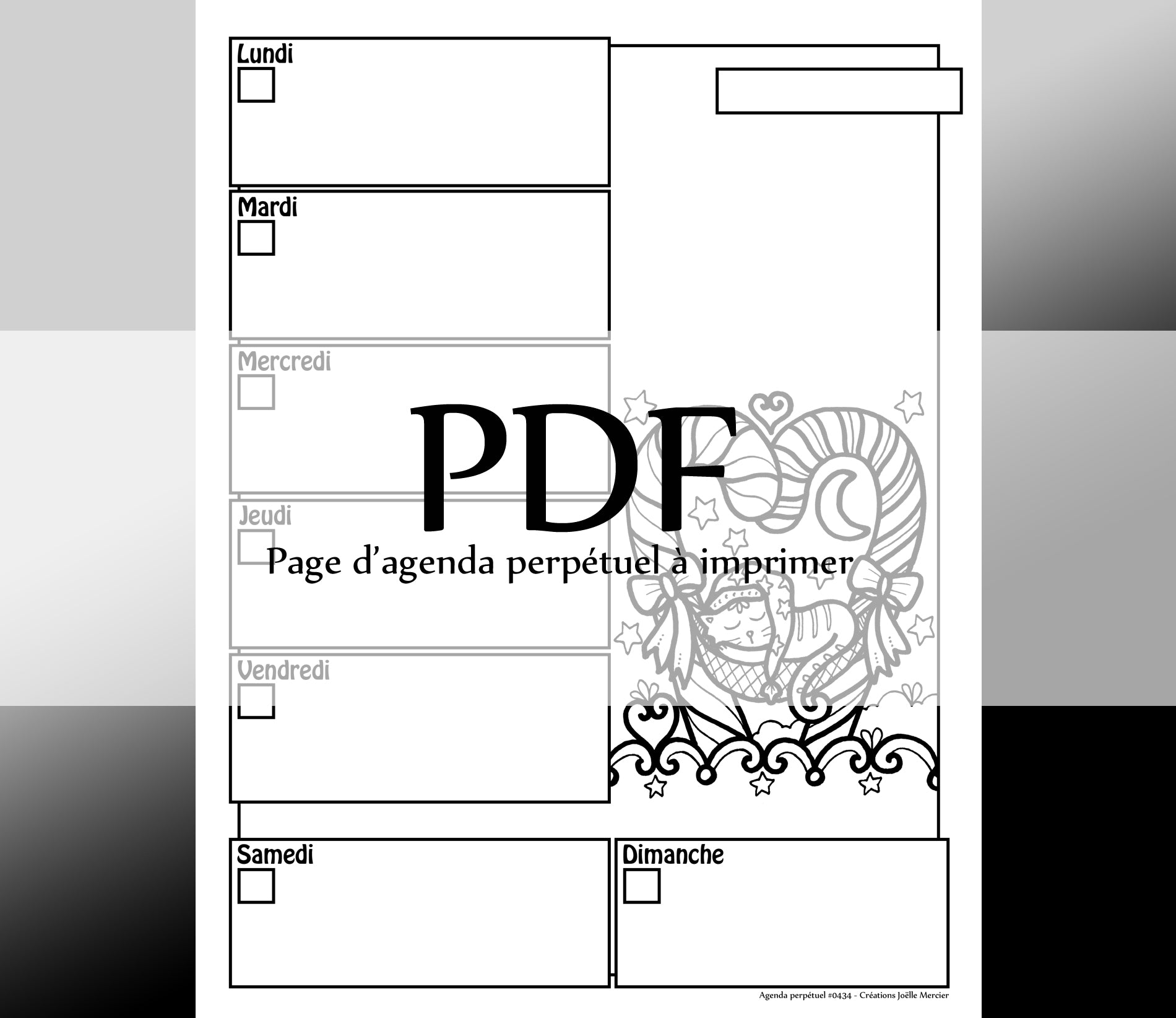 Une page semaine à imprimer pour ajouter à votre agenda perpétuel de Créations Joëlle Mercier.