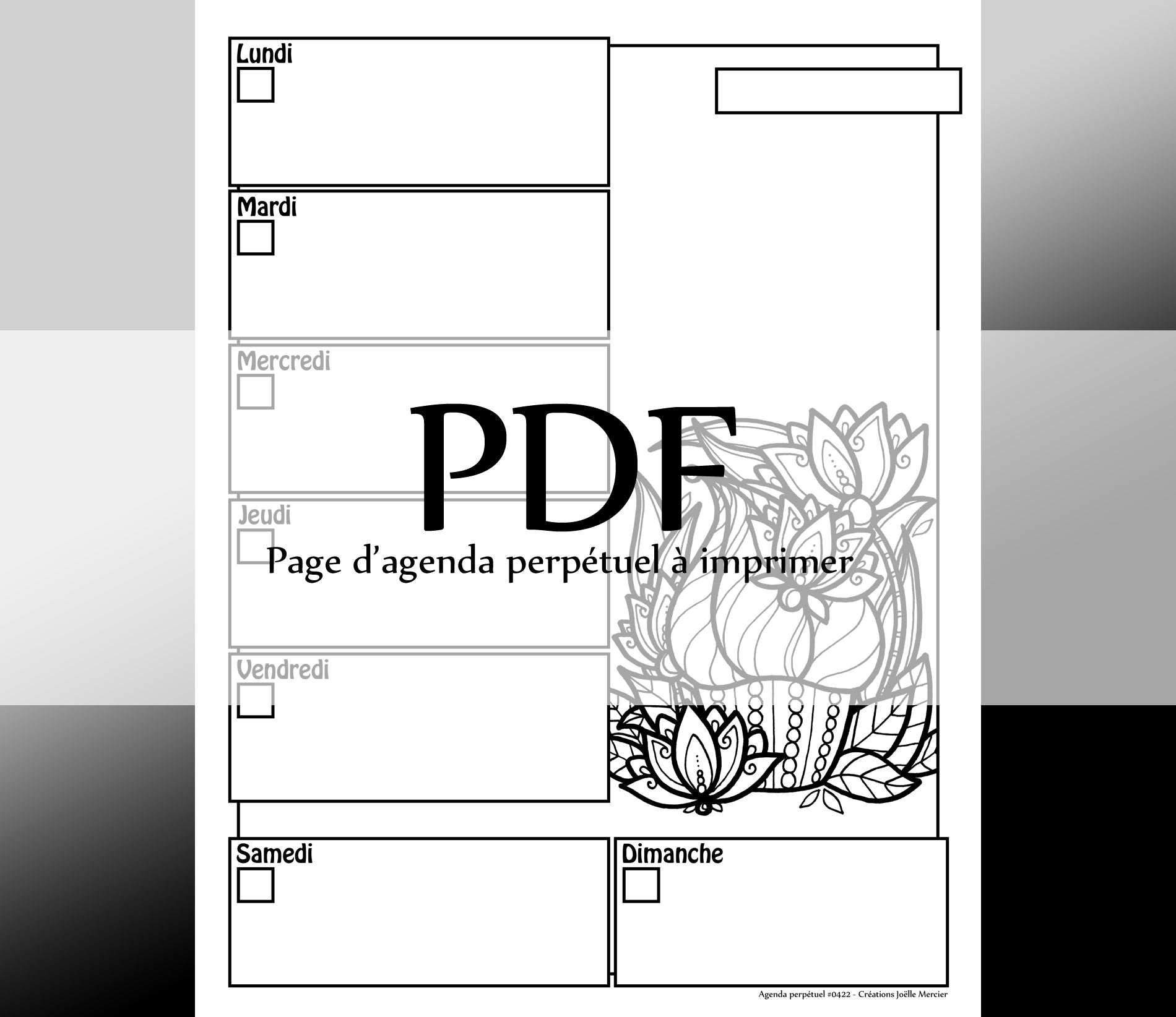 Une page semaine à imprimer pour ajouter à votre agenda perpétuel de Créations Joëlle Mercier.