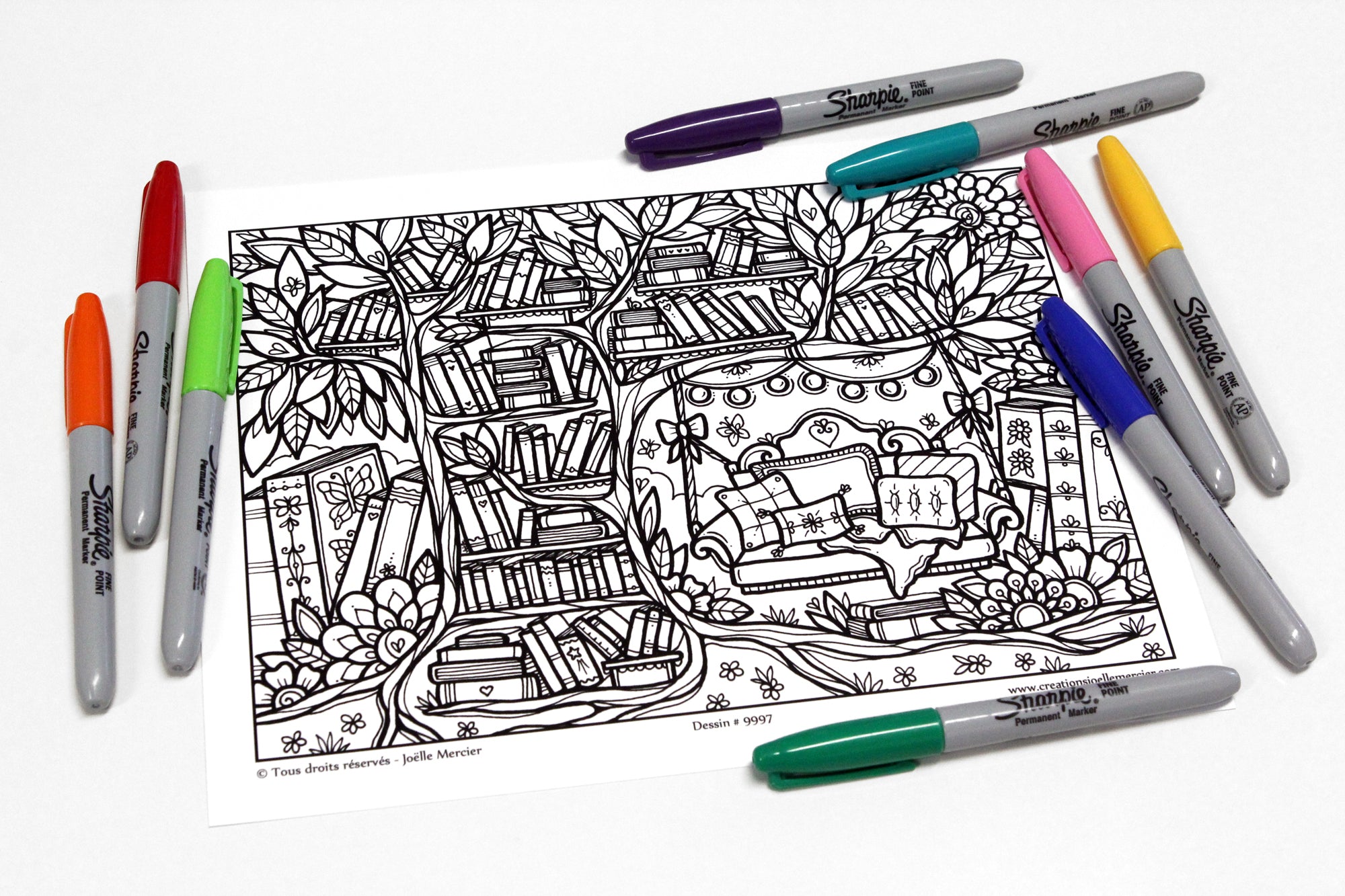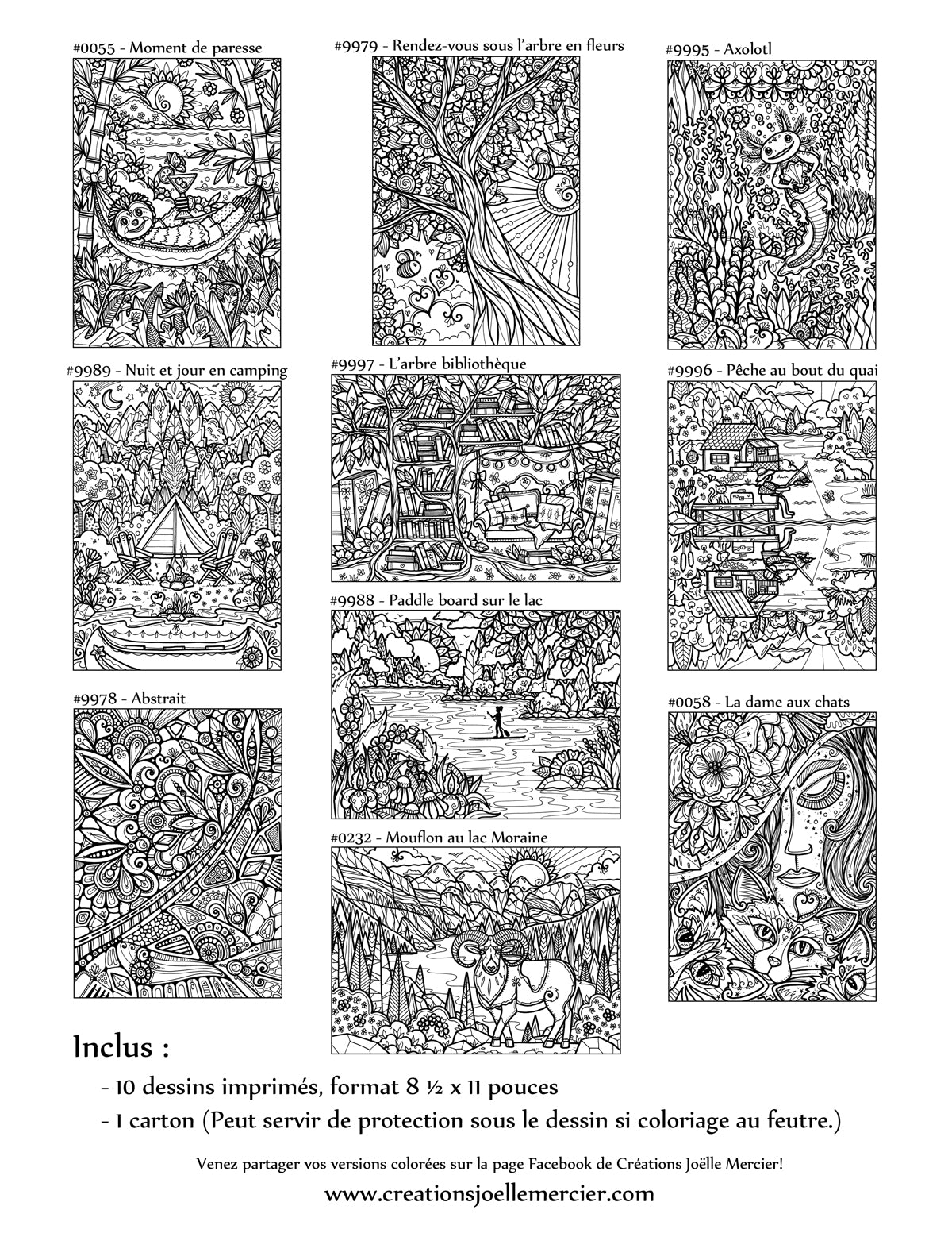 Pochette #47 - 10 dessins - Coloriage de relaxation - Nature, animaux, bibliothèque...