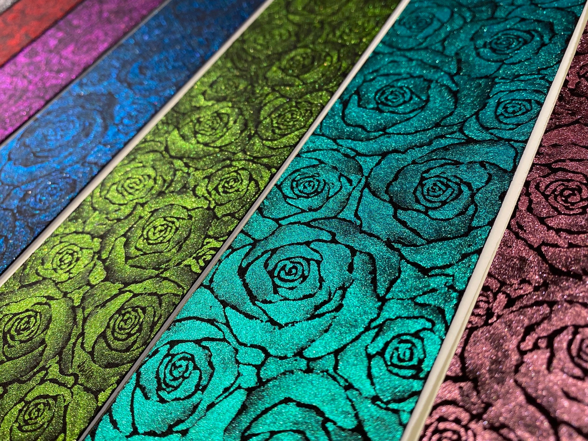 L'aquarelle utilisée est métallique créant ainsi de jolis reflets selon la direction de la lumière.